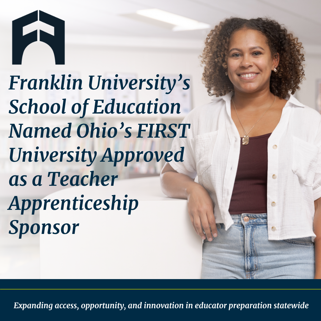 Franklin University’s School of Education, known for preparing practice-ready, mission-driven educators, has achieved a milestone that further elevates its leadership in educator preparation. Franklin has been approved by the Ohio Department of Job and Family Services as the state’s first university to serve as a Teacher Apprenticeship Sponsor, expanding the momentum the School of Education has been building across Ohio.